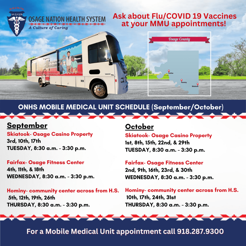 Osage Nation Health System Mobile Medical Unit Scheduled to be in Hominy Community Center (across from H.S.) from 8:30am – 3:30pm