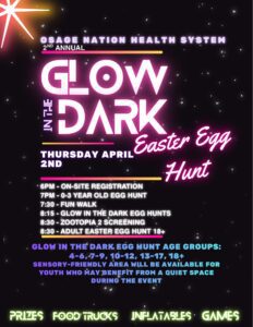 Get Ready to GLOW at the Osage Nation Health System’s 2nd Annual Glow in the Dark Easter Egg Hunt! ![]()